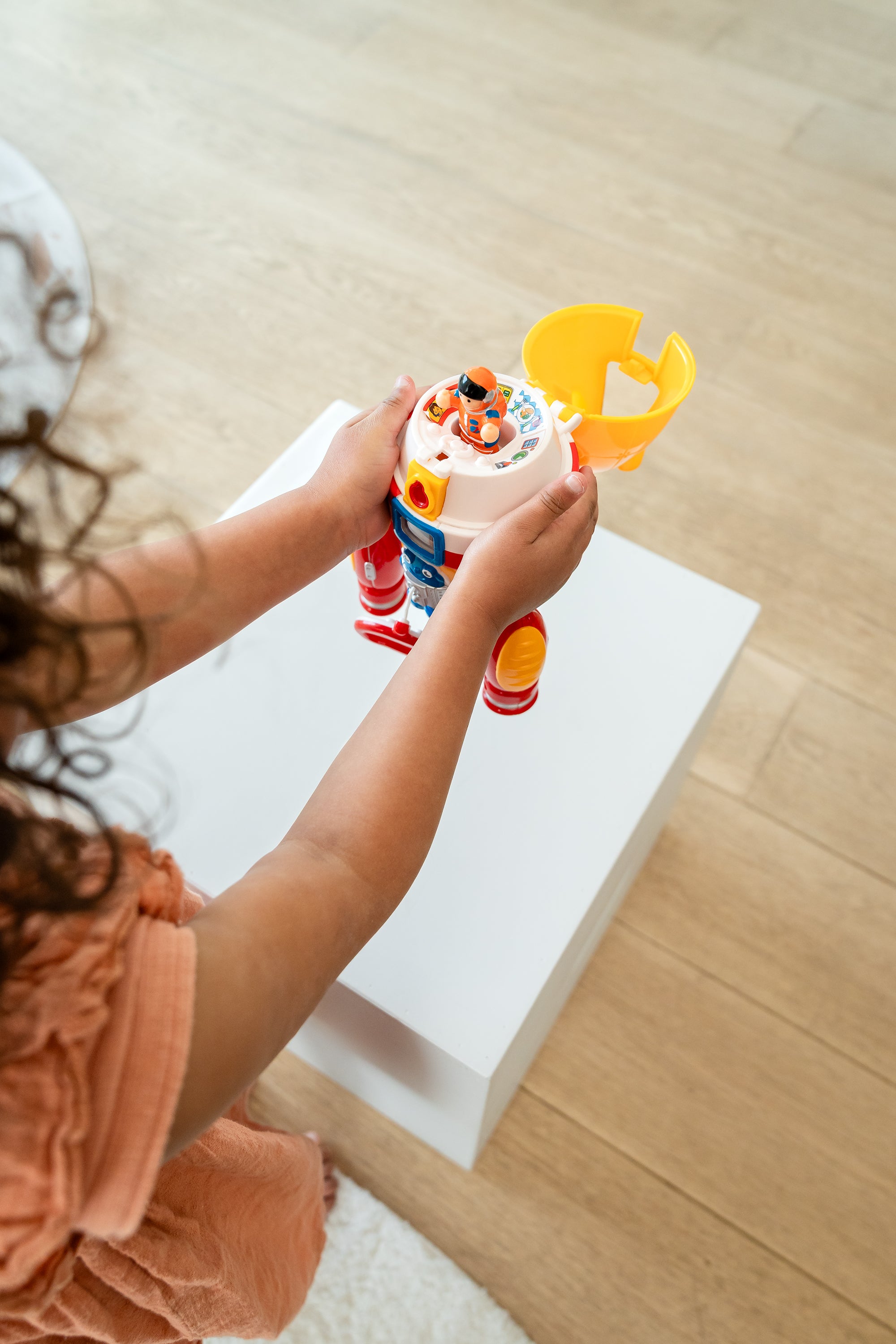 Ronnie RocketSpace Rocket toy is out of this world! Pull Ronnie’s cord to start the countdown! His window numbers go from 5 to 1 while Ronnie shudders and shakes as he approaches blast-off. Push the WOW button to open the cockpit, then place his Astronaut Play Friend inside to send Ronnie flying into orbit on a daring space mission!
