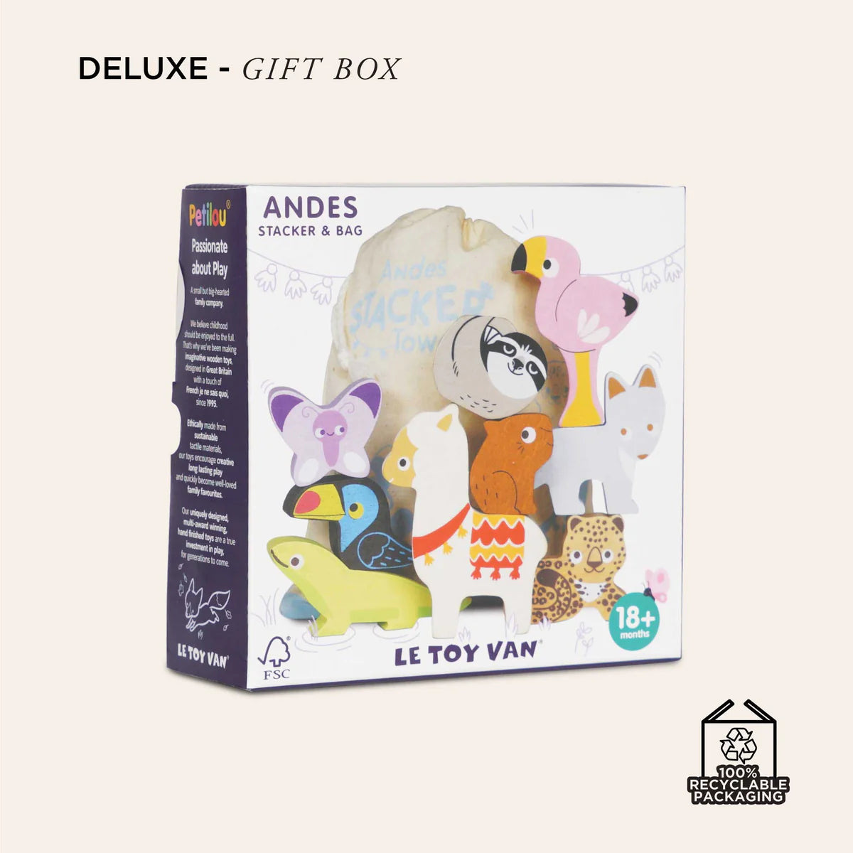 The perfect travel buddy, this set comes complete with a handy cotton storage bag, for stacking fun on the move. A thoughtful gift.