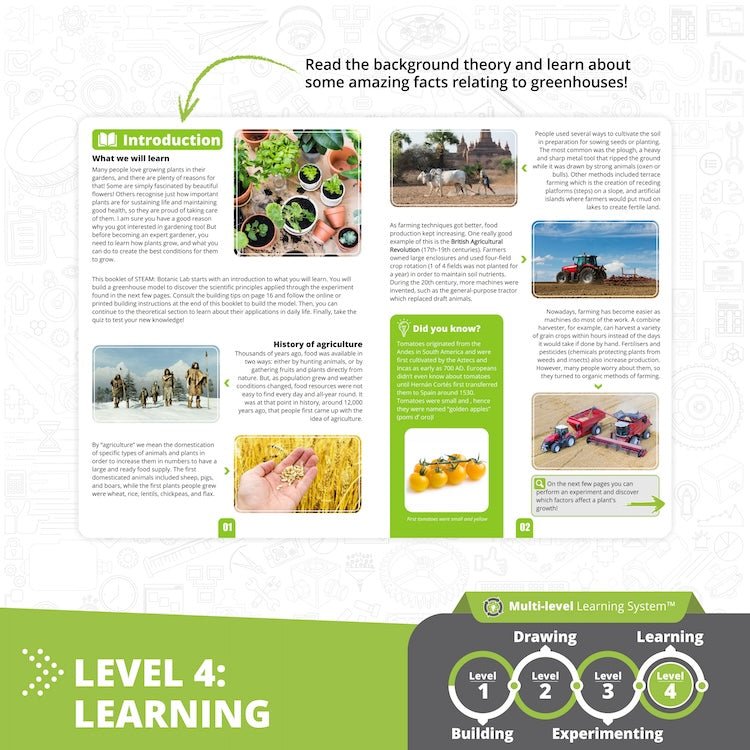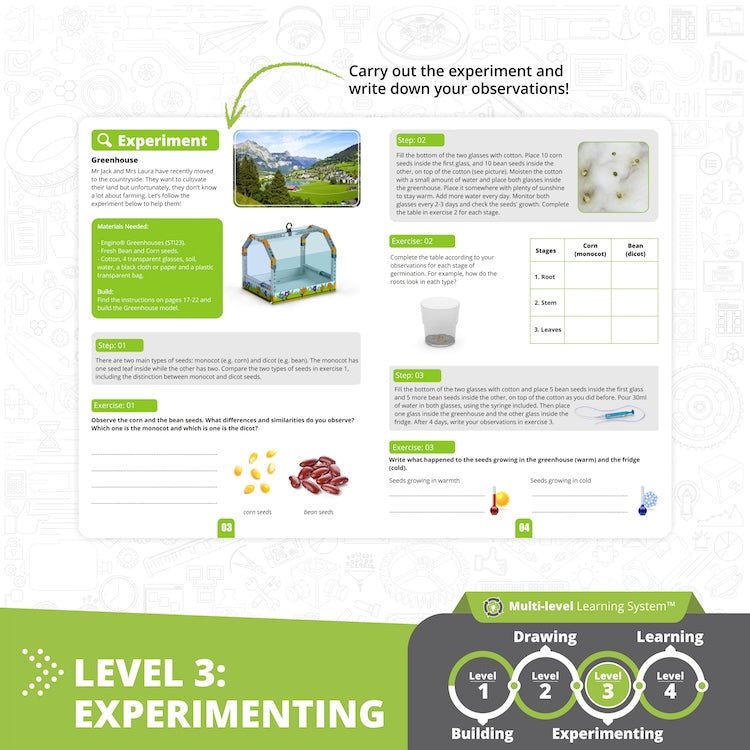 Botanic Lab Science Kit by Engino. Young botanists grow their own plants from seeds inside a fully functional greenhouse they build themselves with this hands-on STEAM toy set! Guided experiments will show little farmers how conditions like light, temperature and moisture affect their crops.
