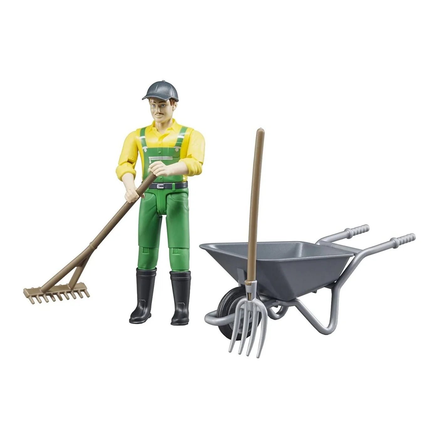 Step into the vibrant world of agriculture with the Bruder Bworld Farmer Figure Set! Designed to complement Bruder's extensive line of harvesting equipment, tractors, trailers, and attachments, this set elevates playtime to new heights of realism and fun. Watch as children's imaginations flourish, fueled by the addition of the farmer figure engaging in various tasks like clearing debris or feeding livestock with the included wheelbarrow, rake and pitchfork. After tending to the farm, the farmer seamlessly transitions into driving a Bruder tractor or combine harvester, cultivating fields with precision and purpose.
