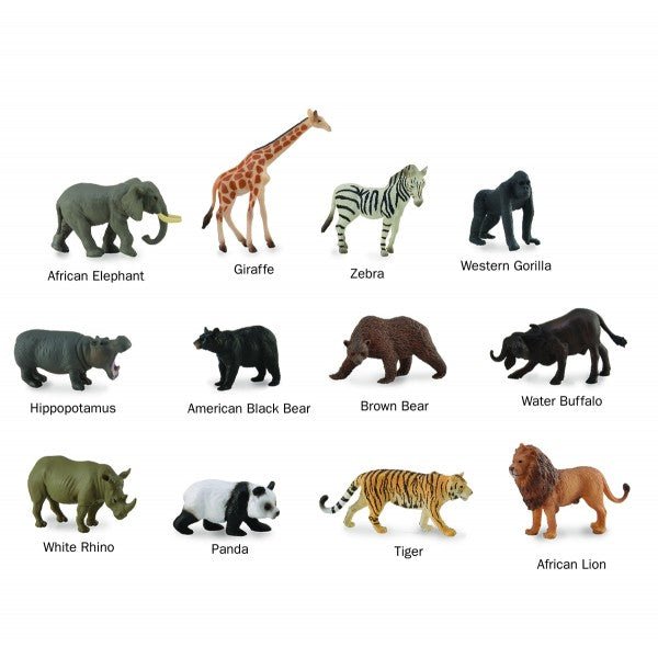 The CollectA mini wild animals tube is the perfect little starter pack for any wild life animal lovers collection. Featuring an African Elephant, White Rhino, African Lion, Panda, Giraffe, Zebra, Tiger, American Black Bear, Water Buffalo, Western Gorilla, Brown Bear and Hippo, these mini animals are perfect for small world play.