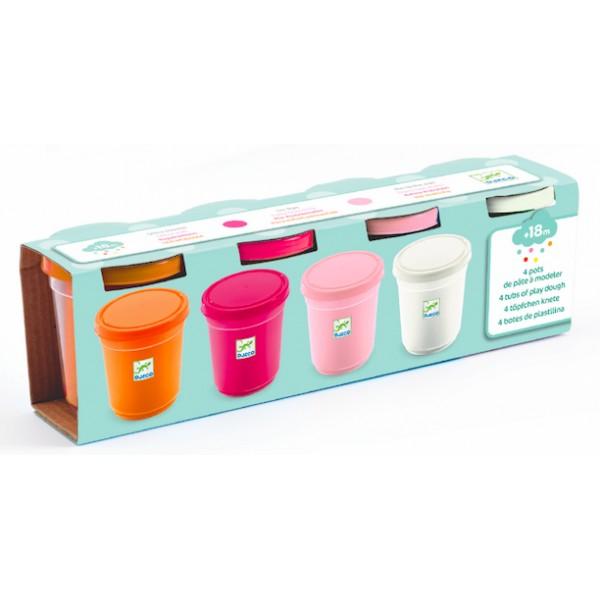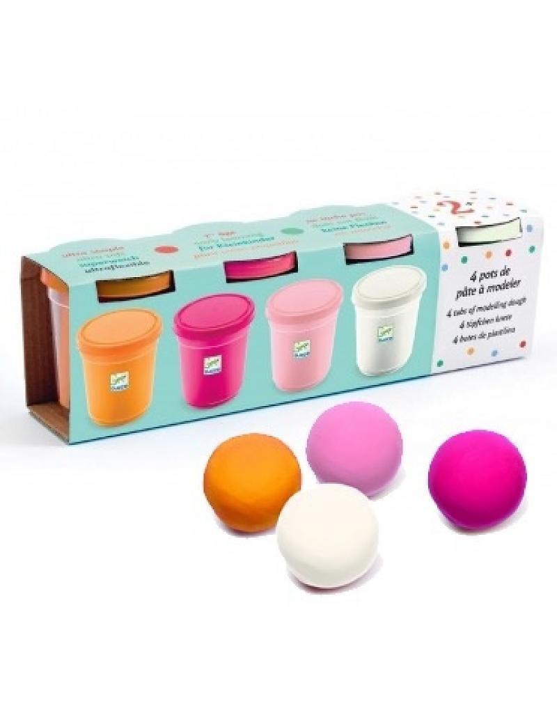 Four tubs of delicately coloured modelling dough from the brilliant toy makers at Djeco. This set of four tubs are perfect on a rainy day or when you need to keep your little ones entertained. The colours are sweet pinks, white and orange. All Djeco modelling dough is ultra-soft and non-staining.