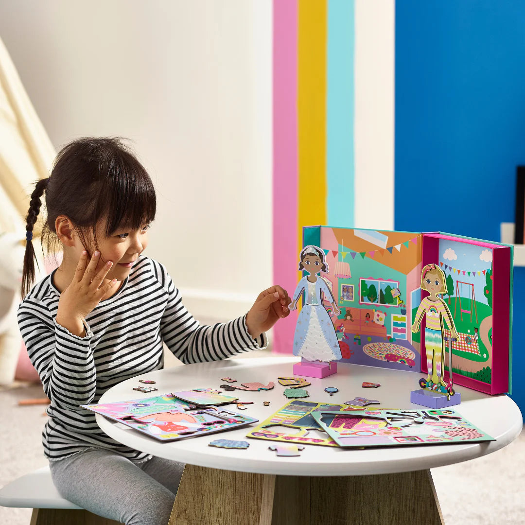 FEATURES: Two magnetic figures and wooden stands Over 70 magnetic outfit and accessory pieces Box doubles up as a backdrop/play scene - with a magnetic scene on one side and a fun play scene on the other Reusable box with magnetic closure for storage Recommended age 3+