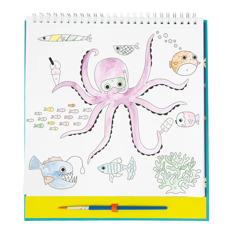 Our Ocean Paint by Numbers contains 10 pictures in a spiral bound pad, featuring super cool Ocean friends. Each page has a perforated edge making it super easy to tear out your artwork and frame or hang your masterpiece! Each Paint by Numbers set also comes with 10 individual paint palettes and a paintbrush, plus an elastic closure to keep everything neatly together.