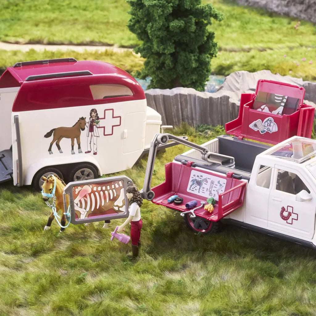 The Schleich Horse Club Mobile Vet with Trailer playset lets young horse lovers care for their animals wherever adventure takes them. When the Tennessee Walker foal needs help, Mrs. Kramer arrives in her pick-up with a detachable trailer packed with medical gear. With an X-ray machine, ointments, bandages, and grooming tools, everything needed for a full check-up is included. The foal is sure to feel better in no time. This detailed set encourages imaginative roleplay and introduces kids to animal care in a fun, hands-on way—perfect for young horse fans and future vets.