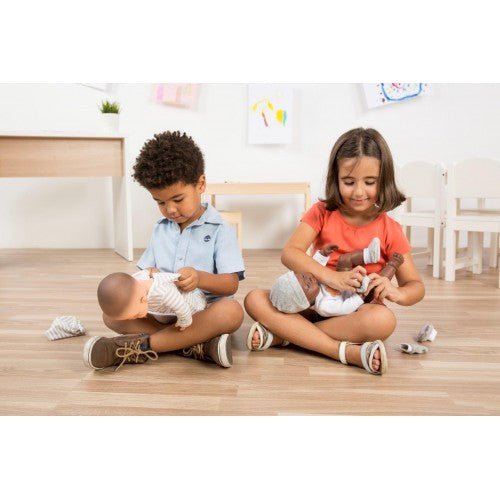 Designed to promote nurturing role play, your little one will be encouraged to develop their fine motor skills while dressing their baby doll. This sweet 2 piece set is made to be easy for little hands to dress and undress their dolly.