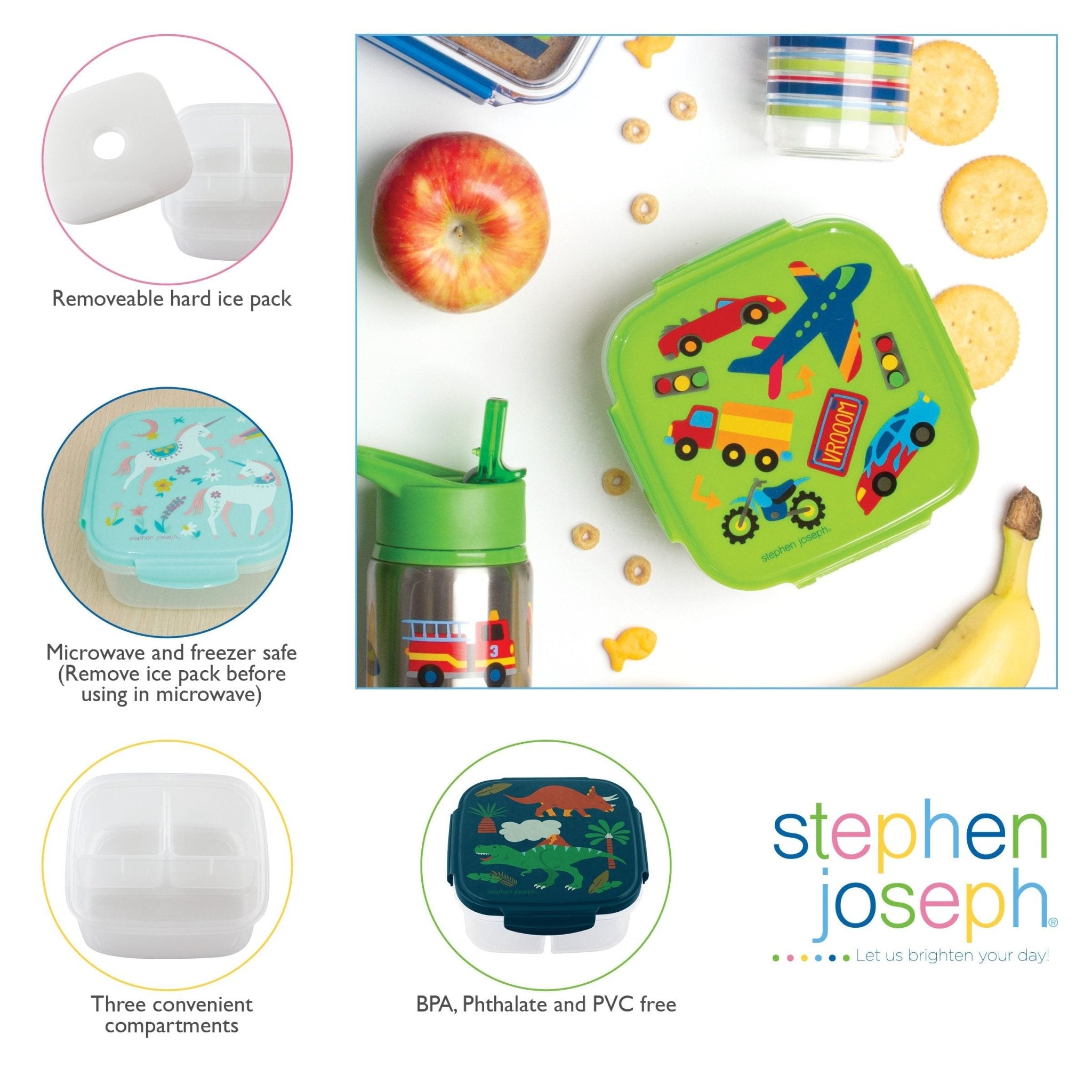 Lunch time will be extra fun with this cute snack box from Stephen Joseph. The removable, hard ice pack sits snuggly inside the lid to keep snacks cool throughout the day. The clip-top lid is easy for little hands to open and close for maximum freshness. Each snack box has three compartments to keep snacks separate.