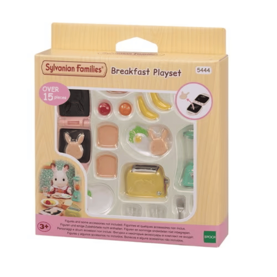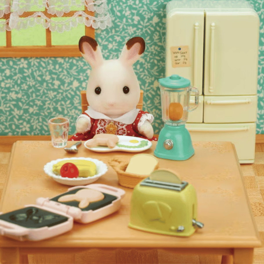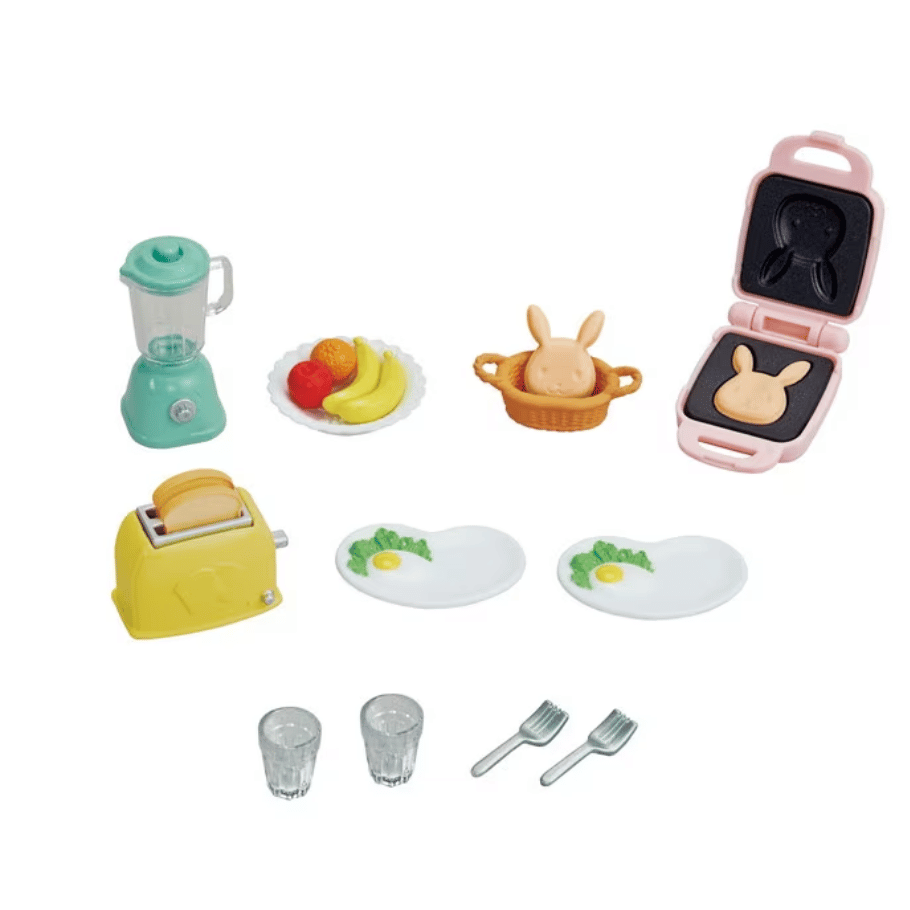 The Breakfast Playset includes breakfast and cooking utensils. Includes fried eggs, bread and fruit. Bread can be placed in the pop-up toaster. Make toast by moving the lever. Have even more fun playing together with other Sylvanian kitchen furniture sets (sold separately).