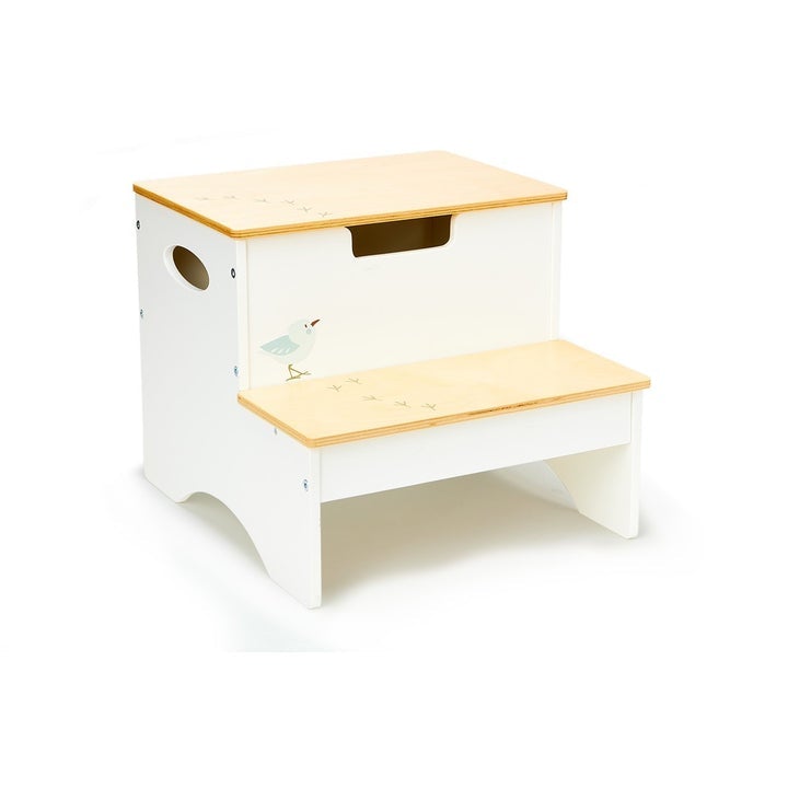 A very handy step and integral storage product based on a traditional and very useful design. With a sweet little bird illustration and birdie footprints.