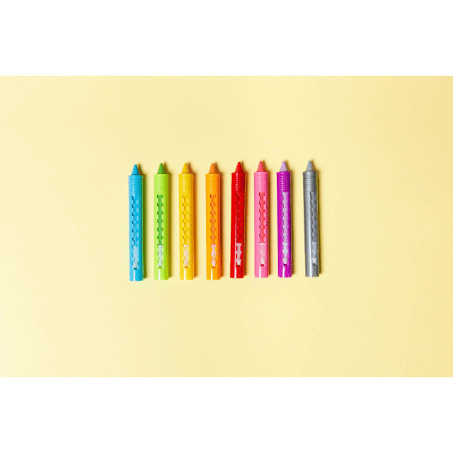 Each set contains 8 coloured crayons with adjustable holder and cleaning cloth.