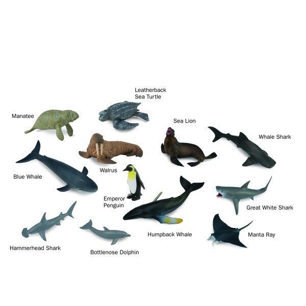 This set includes the Manatee, Leatherback Sea Turtle, Sea Lion, Whale Shark, Blue Whale, Walrus, Emperor Penguin, Humpback Whale, Great White Shark, Hammerhead Shark, Bottlenose Dolphin, and Manta Ray.