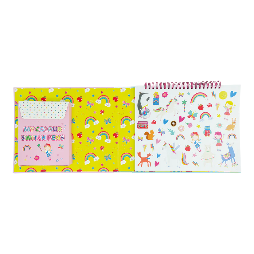 Double the fun with Colour Switch Magic! The magic white pen turns 6 colours into 12, resulting in hours of fun creating patterns and more. Each pad contains 10 doodle pages, 5 colour-in pages, 6 colour switch pens, 1 magic pen, 5 lined pages for writing and 2 sticker pages.
