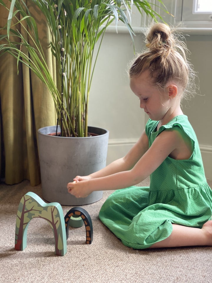 An accessory to the Wild Pines Train Set, these 4 interlocking tunnel style pieces are evocative of the forest, its foliage, a tunnel, and a cute little owl tucked away in amongst the branches.
