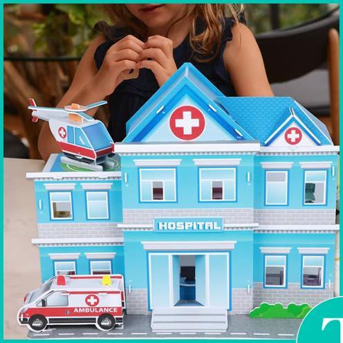 Create your own fabulous Hospital model, complete with staff and vehicles. Follow the assembly instructions to pop out the rigid foam board parts and connect the numbered parts to build the 3D model. No glue, no scissors, no tools needed.