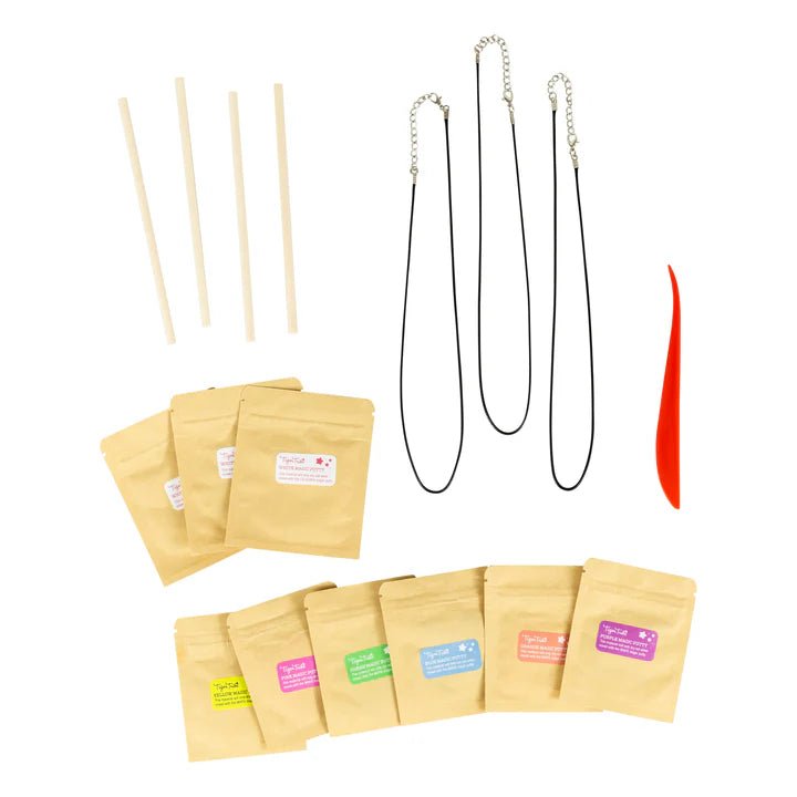 - Each set includes: 6x Magic Putty colours, 3x white mixing Magic Putty’s, 4x wooden twisting tools, 3x vegan leather necklace cords, 1x red putty knife