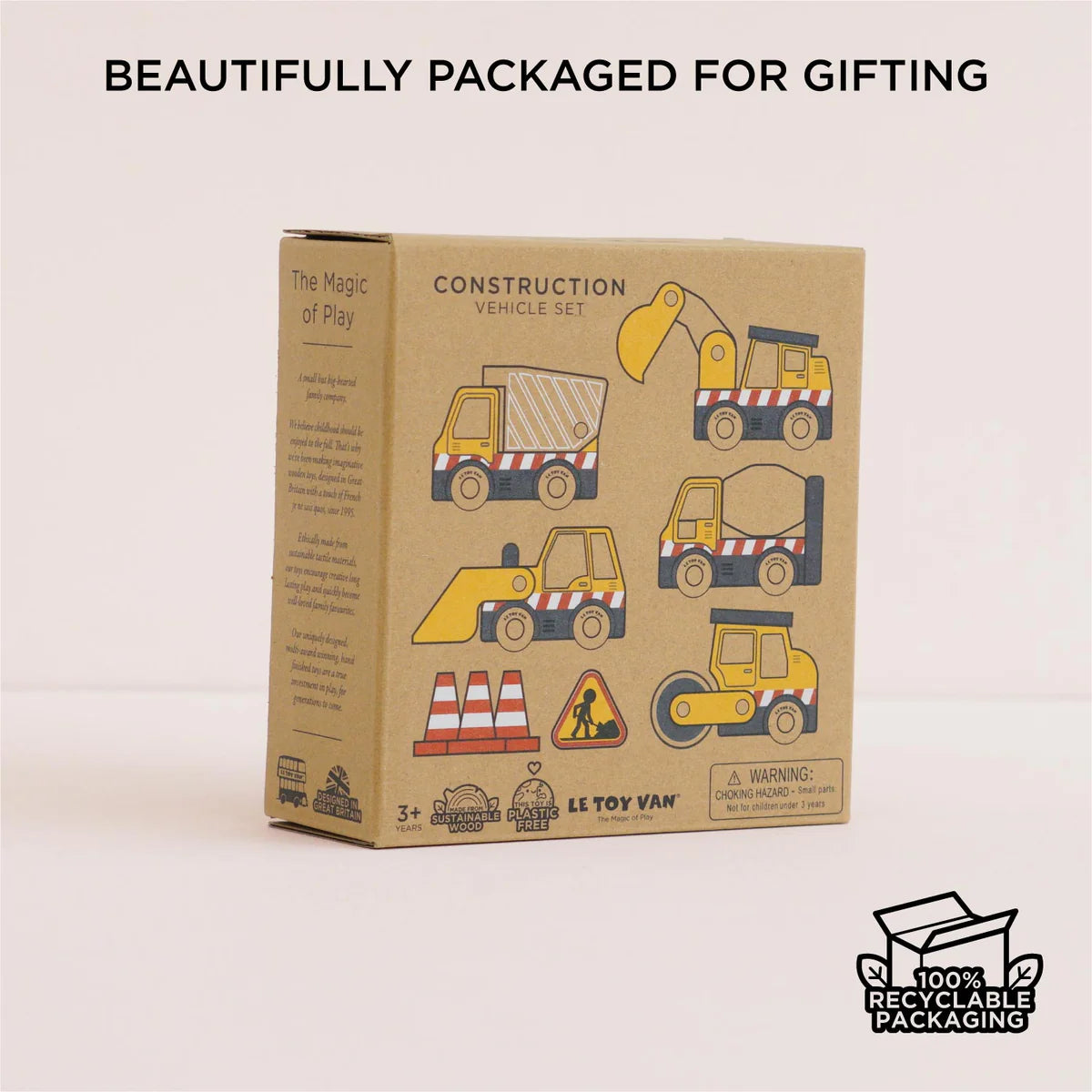 Budding builders are sure to love our best-selling construction set, a lovely plastic free toy for eco-friendly play. Take imaginations off to new adventures with this 9 piece toy which includes a digger, cement mixer, dump truck, roller, front loader, cones and road works sign. Each vehicle is made from FSC ® - certified wood with wooden wheels and features a moving part for realistic play possibilities.
