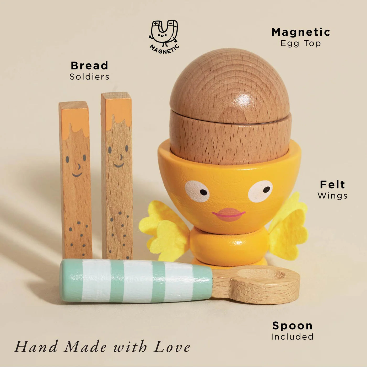 The hand stitched felt wings add a wonderful touch to this high quality toy, which comes complete with a wooden egg with magnetic top, two hand painted solid wood 'soldiers' and a painted wooden spoon.