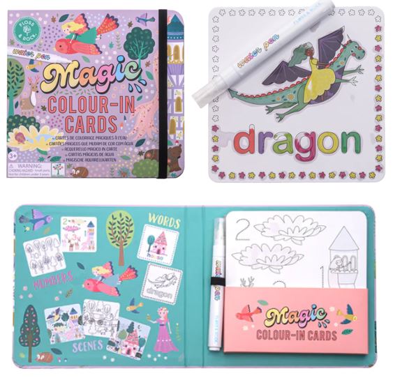 Each card has either words, numbers or scenes to colour in. It also encourages learning through play!