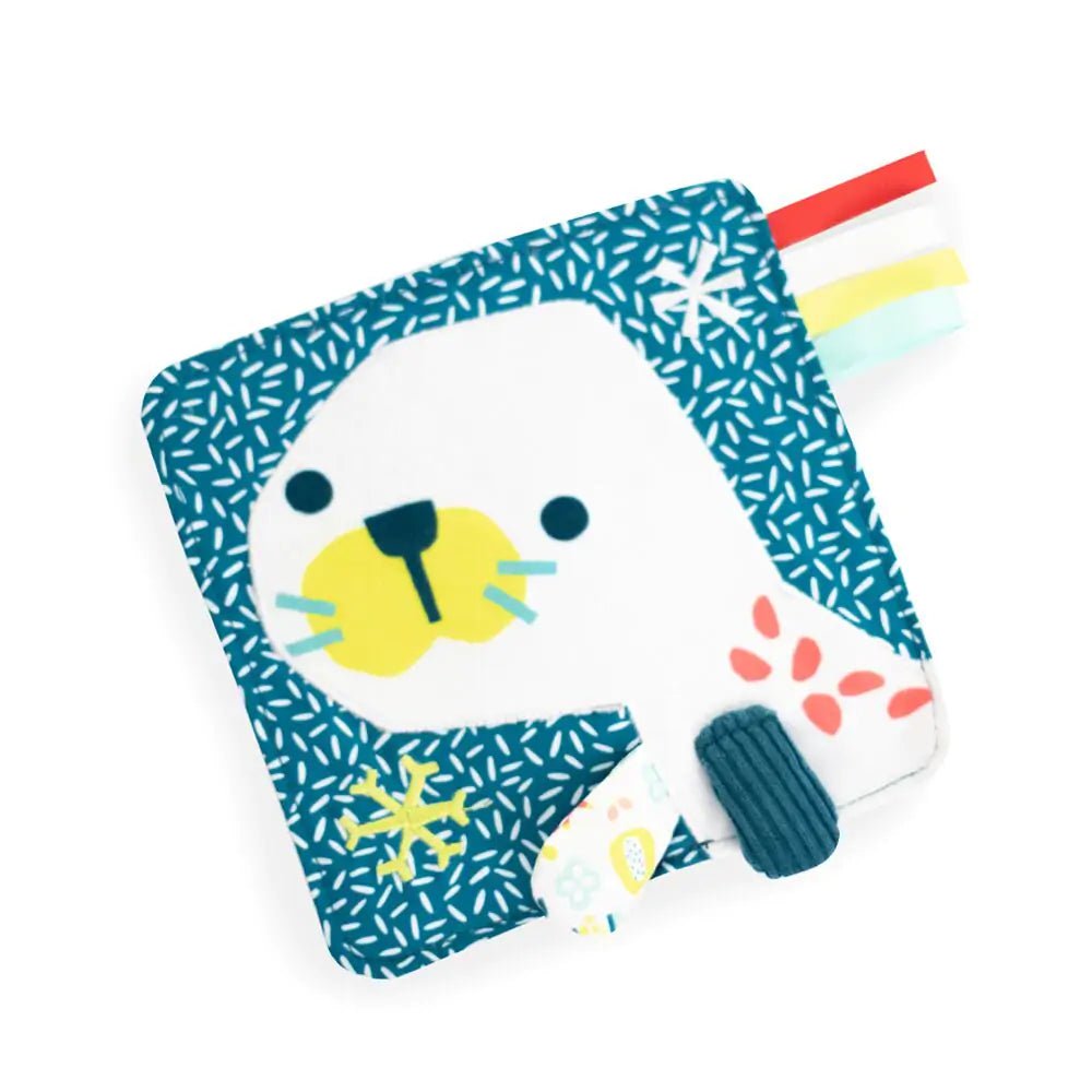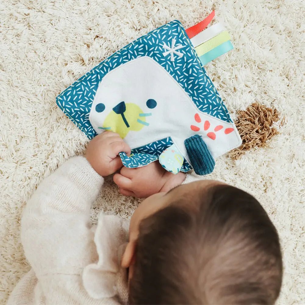 With contrasting colours and different textures, this cloth is a festival for the senses. The sea lion at its center is not only adorable, but promotes stimulation of touch, hearing, and sight. Crisps, textures and surprises in every squeeze!