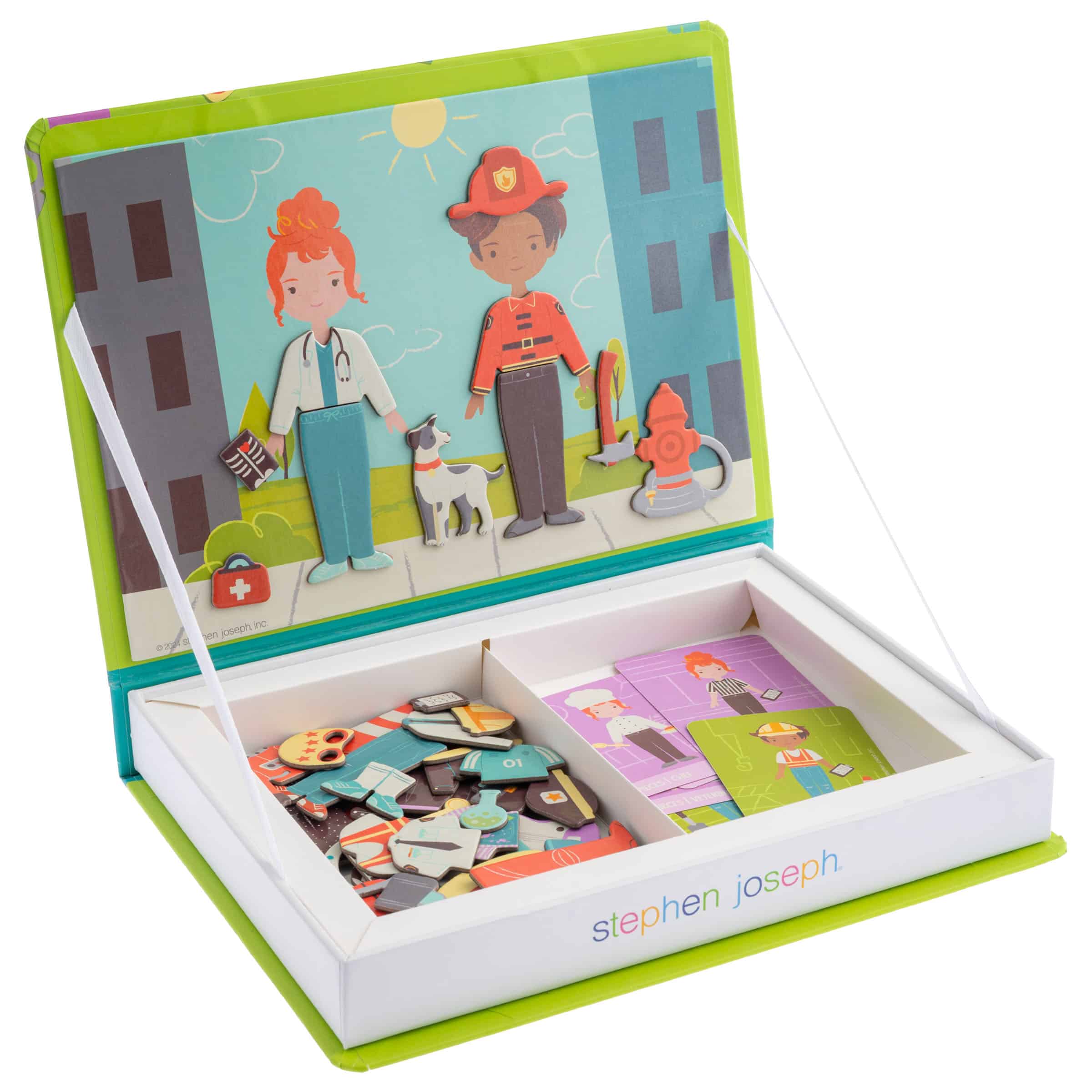 The clever book-style design opens to reveal a magnetic play scene with built-in compartments to keep everything neatly stored. Perfect for travel, this portable set keeps kids entertained on car rides, flights, or quiet afternoons at home.