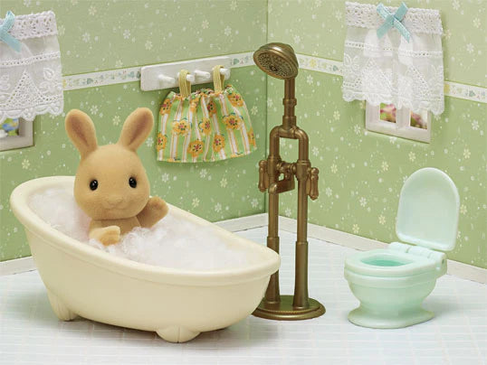 It's bath time fun with chocolate rabbit boy's bath time set! Watch as chocolate rabbit boy enjoys a relaxing soak in his cozy tub, surrounded by bubbles. This delightful set includes everything needed for a charming bathroom setup in your Sylvanian families world.